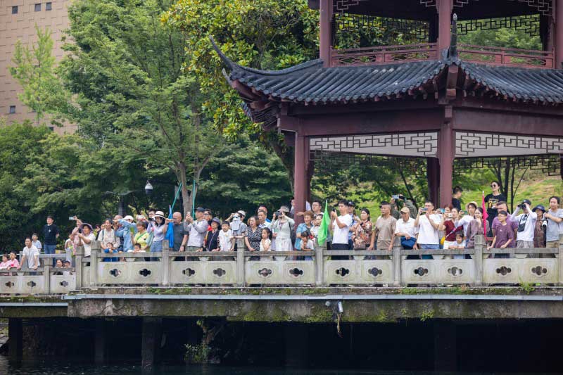 9支参赛队伍分别登场亮相,龙舟健儿高喊着振奋人心的口号,呐喊声响彻新安江畔。